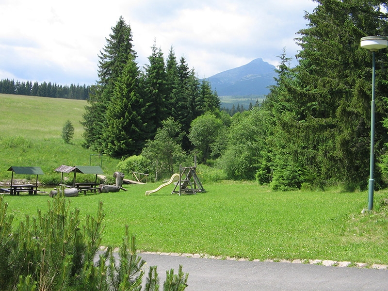 veľké asfaltové ihrisko na volejbal, basketbal a tenis, priestranný trávnatý areál, detské ihrisko, preliezačky, hojdačky, ohnisko, stolný tenis.