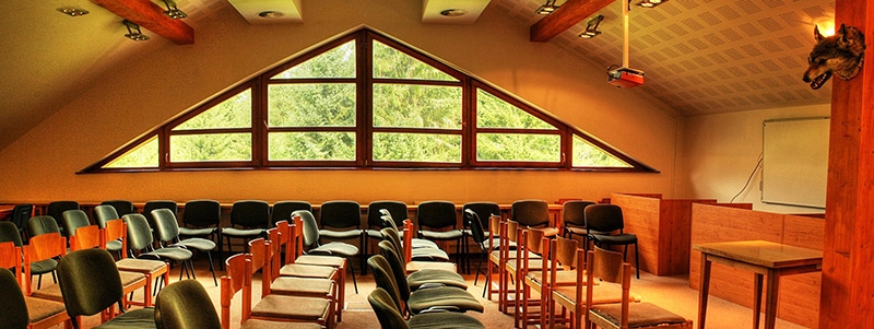 jedáleň, spoločenská miestnosť, priestranná konferenčná miestnosť s interaktívnou tabuľou a audiovizuálnou technikou.